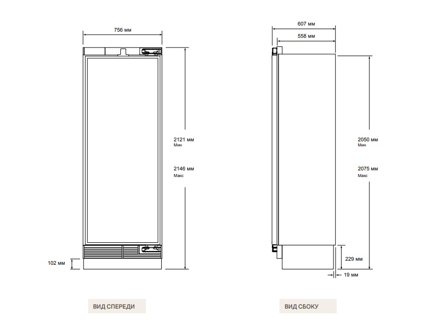 В линейке приборов есть два размера – 75 и 60 см. В боковую стенку встроен диспенсер для воды. Внутренние части прибора выполнены из нержавеющей стали, стекла и АБС-пластика.